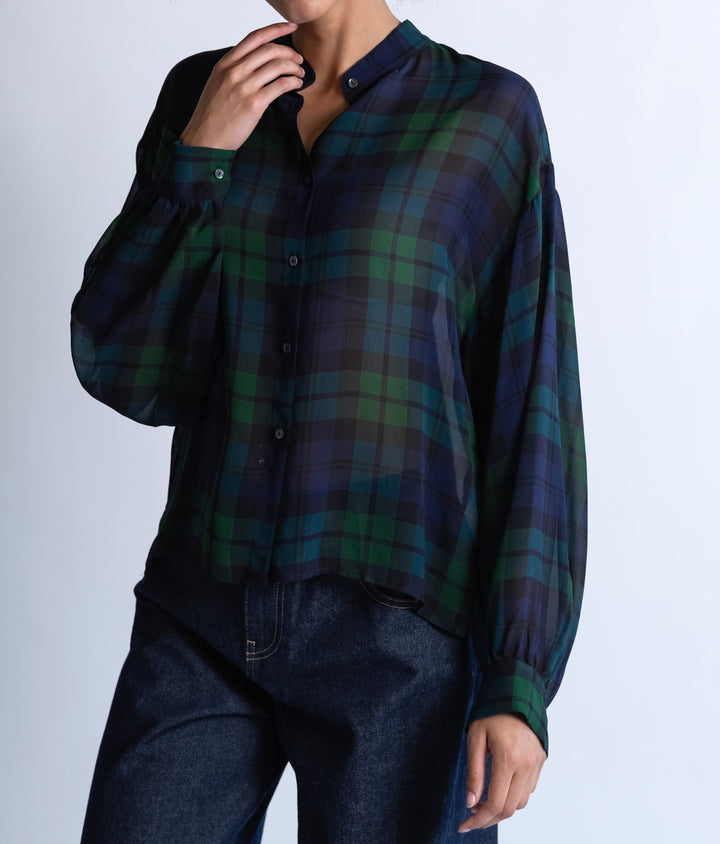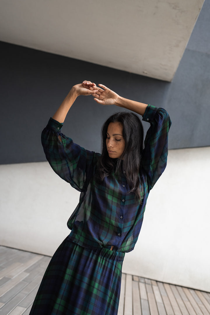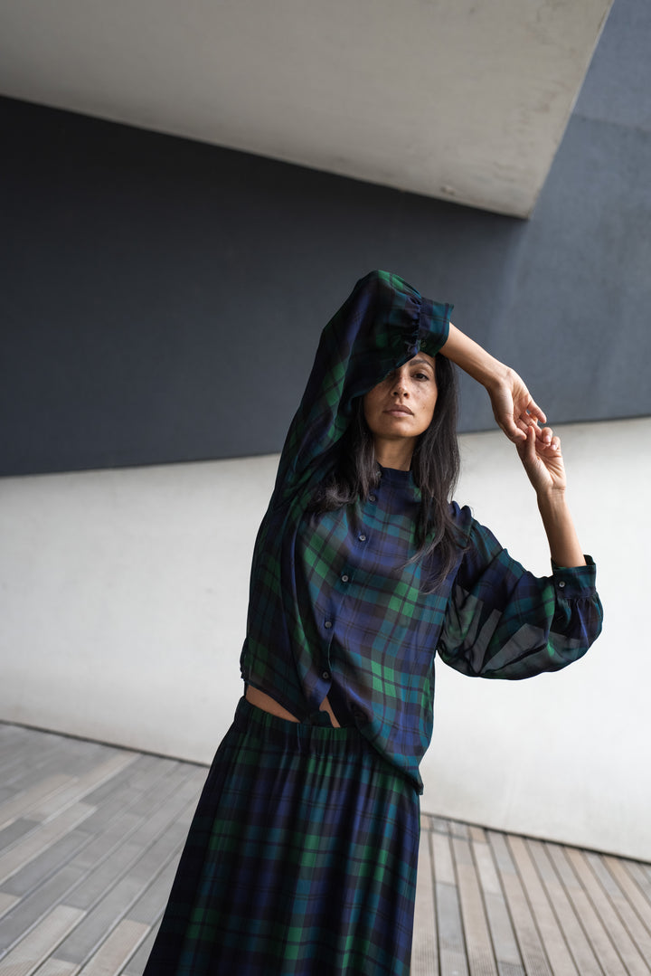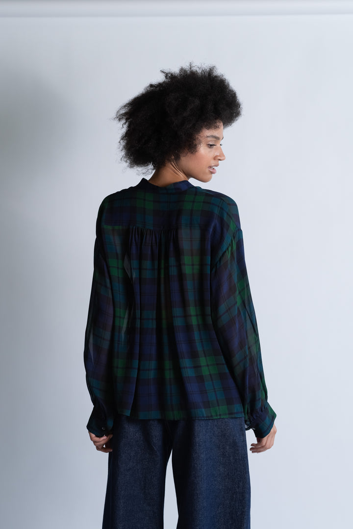 Camicia morbida con maniche ampie e arricciatura dietro in viscosa quadro balckwatch nei colori verde blu e nero.