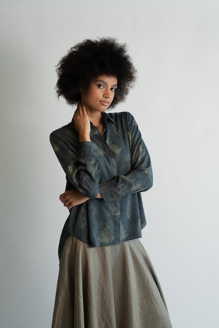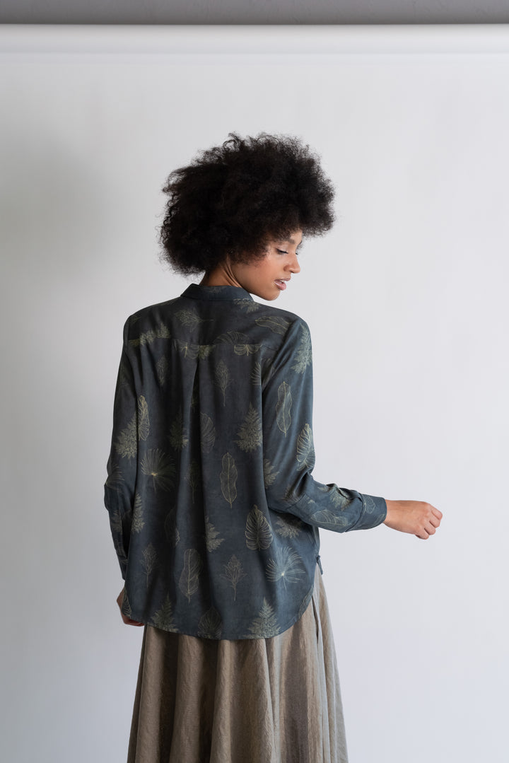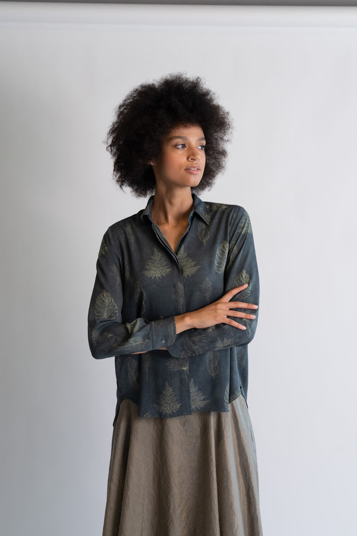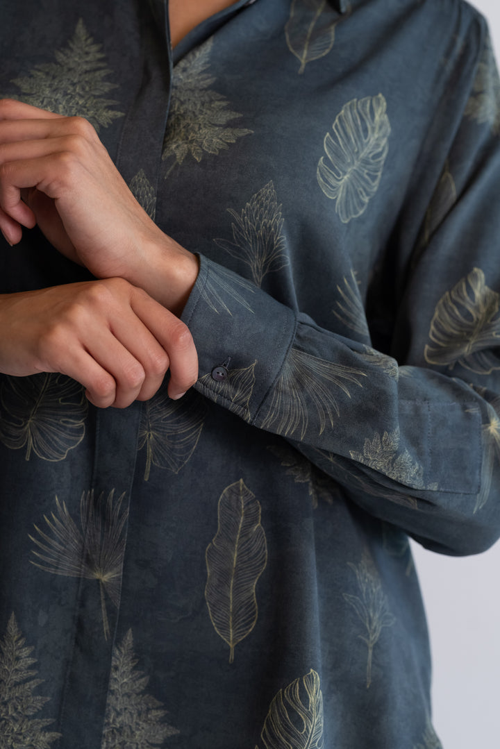 Camicia taglio uomo con bugia dietro, stampa botanic in twill di viscosa .