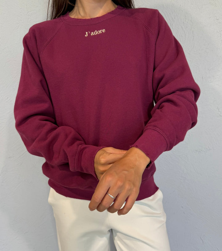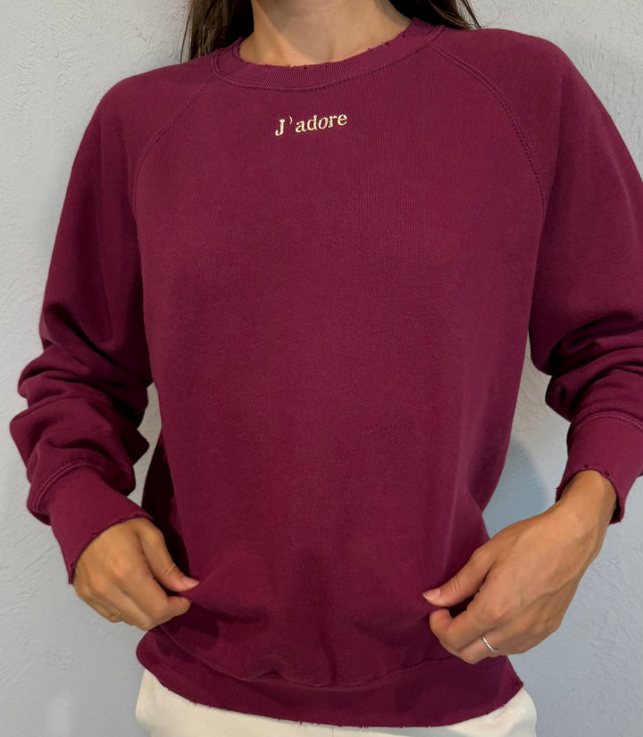 Felpa girocollo con rotture su polsi , fondo e collo, particolare del ricamo "J'adore" in filo dorato sul davanti.