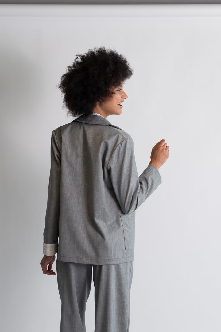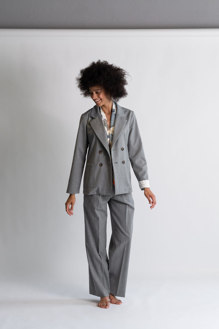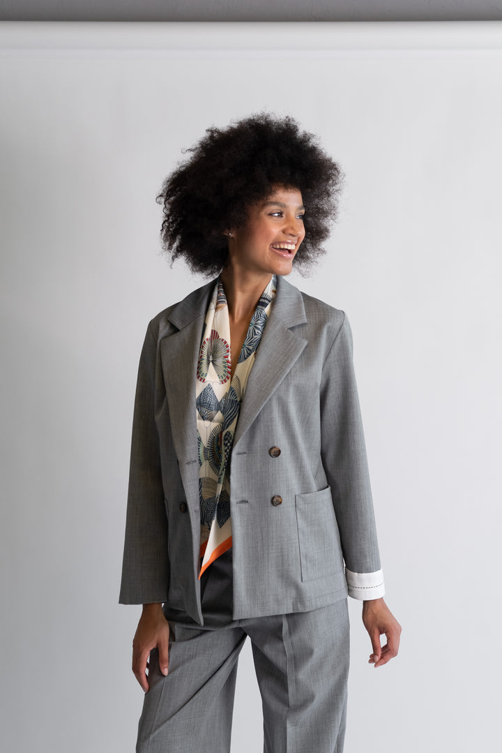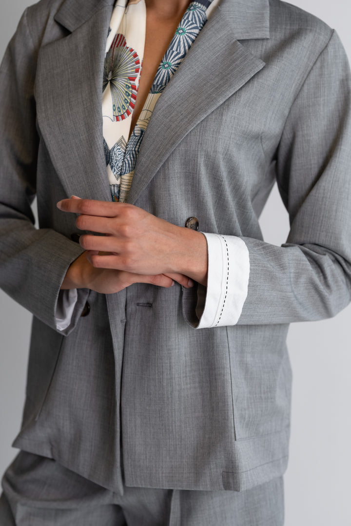 Giacca doppio petto in fresco lana con particolare sbiego uomo su manica.