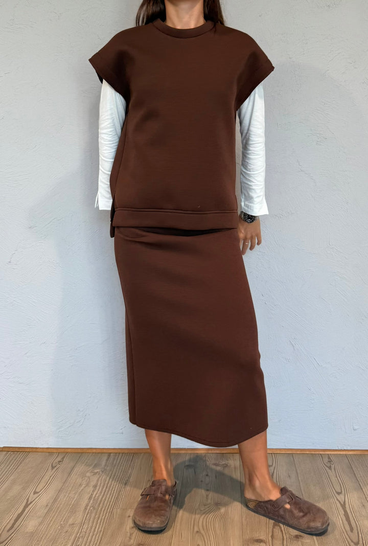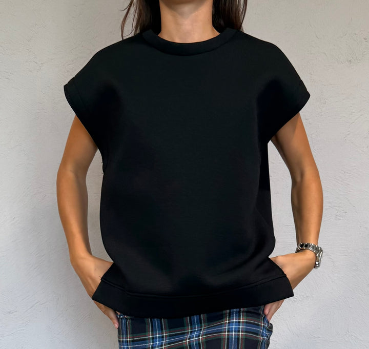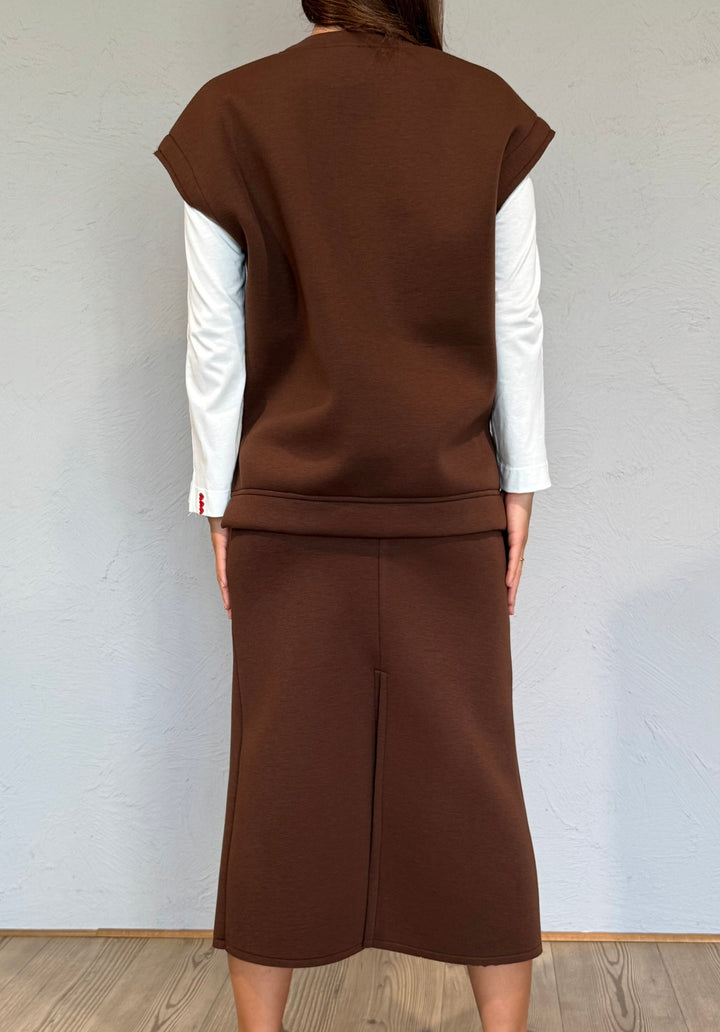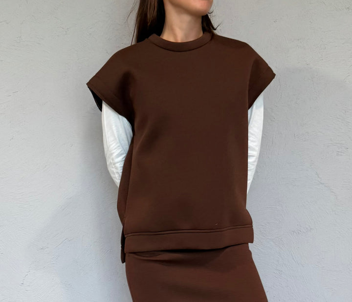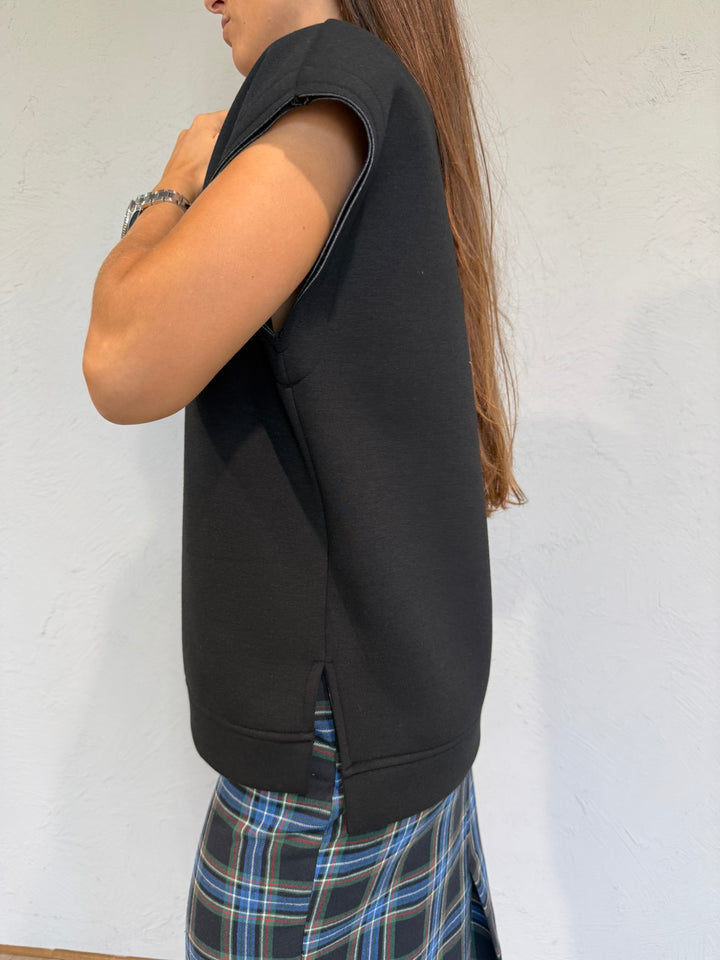 Gilet over girocollo in neoprene con dettaglio cuciture sul giro manica e sul fondo e spacchi laterali.