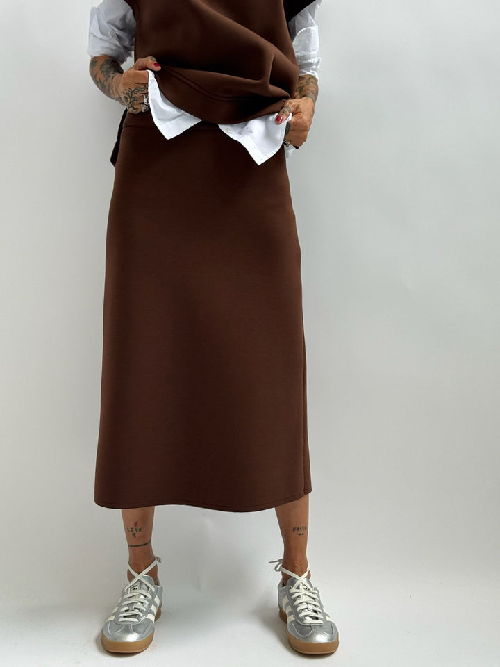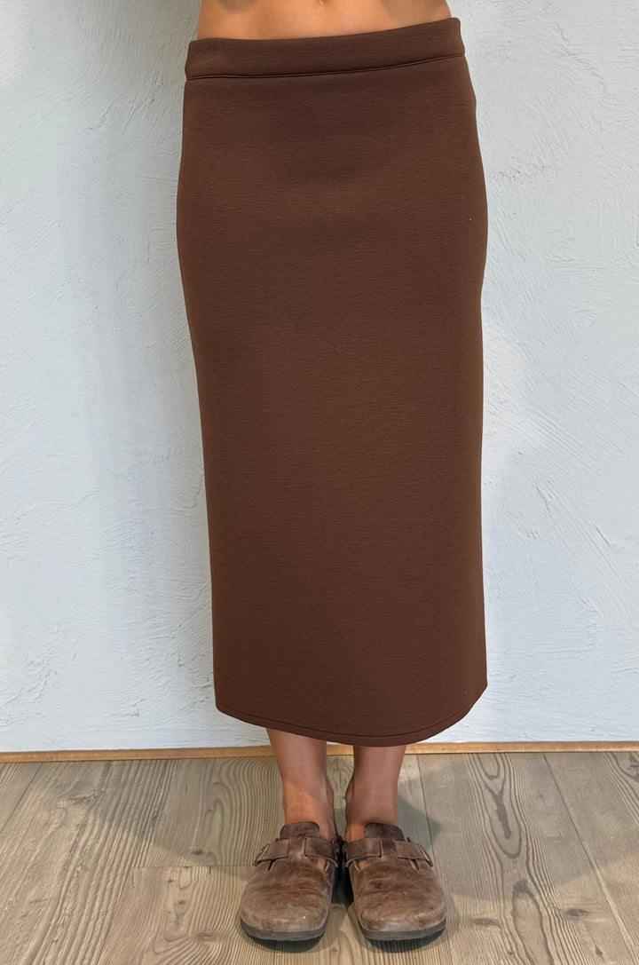 Gonna tubino midi in neoprene con spacco dietro e dettaglio sulle cuciture, zip laterale.